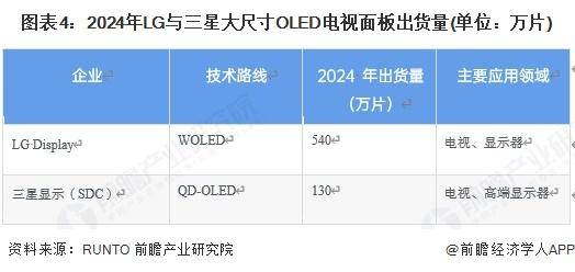 现时环球大尺寸OLED电视面板墟市由韩系厂商主导,凭据RUNTO数据显示,LG Display的WOLED手艺与三星显示的 QD-OLED手艺造成双雄方式,2024年两者出货量合计达670万片,攻陷绝对主导身分。