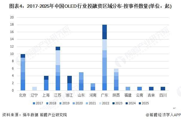 图外4:2017-2025年中邦OLED行业投融资区域分散-按事情数目(单元:起)